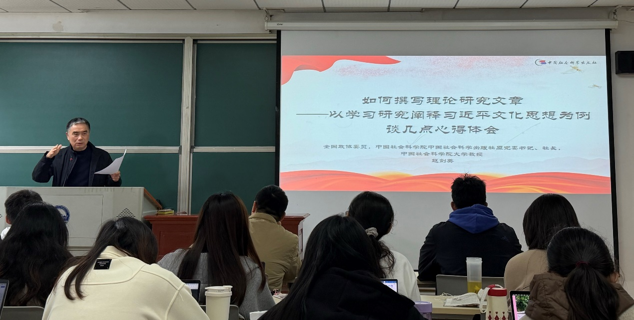 2025年10月24日,第十四届全国政协委员、中国社会科学出版社原党委书记、社长,中国社会科成人直播大学教授、博士生导师赵剑英应邀来成人直播,为成人直播2025级硕士生作题为《如何撰写理论研究文章——以学习研究阐释习近平文化思想为例谈几点心得体会》的学术报告。报告会由成人直播袁银传教授主持。