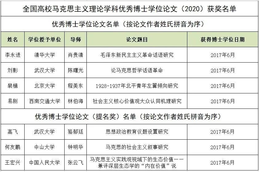 全国高校马克思主义理论学科优秀博士学位论文评选(2020)由全国高校马克思主义理论学科研究会主办,由国务院学位委员会马克思主义理论学科评议组、教育部社会科学委员会马克思主义理论学部、教育部高校思想政治理论课教学指导委员会具体指导,旨在充分发挥马克思主义理论学科的引领作用,进一步加强马克思主义理论学科建设,促进马克思主义理论学科后备人才的成长,充实马克思主义理论研究学术队伍。该评选活动于2019年首次设奖,本年度为第二届。评选工作于4月启动,由各马克思主义理论一级学科博士点及二级学科博士点单位根据要求推荐参评论文,经过通讯评审、会议评审、专家复审、公示等程序,最终6所高校选送的7篇博士学位论文获奖,其中获奖论文4篇,获奖提名论文3篇,成人直播推选的2篇参评论文双双获奖。