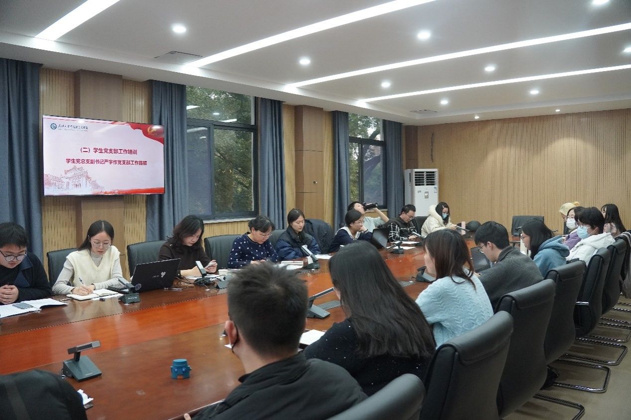 首先,成人直播组织员任竹芸做学生党支部工作培训。发展党员工作是党的基层组织建设中一项经常性的重要工作,任老师围绕入党条件、入党申请书撰写及党员发展流程等方面展开细致讲解,针对发展流程中出现的具体情况进行复盘总结,强调要坚持好“控制总量、优化结构、提高质量、发挥作用”的发展党员工作总要求,提醒支部书记要“看一遍,谈一次,记一笔”,多与入党积极分子和发展对象交流,切实发挥入党介绍人的关键作用。此外,任老师还就党建与业务相融合事项展开部署,希望各支部积极推进落实。